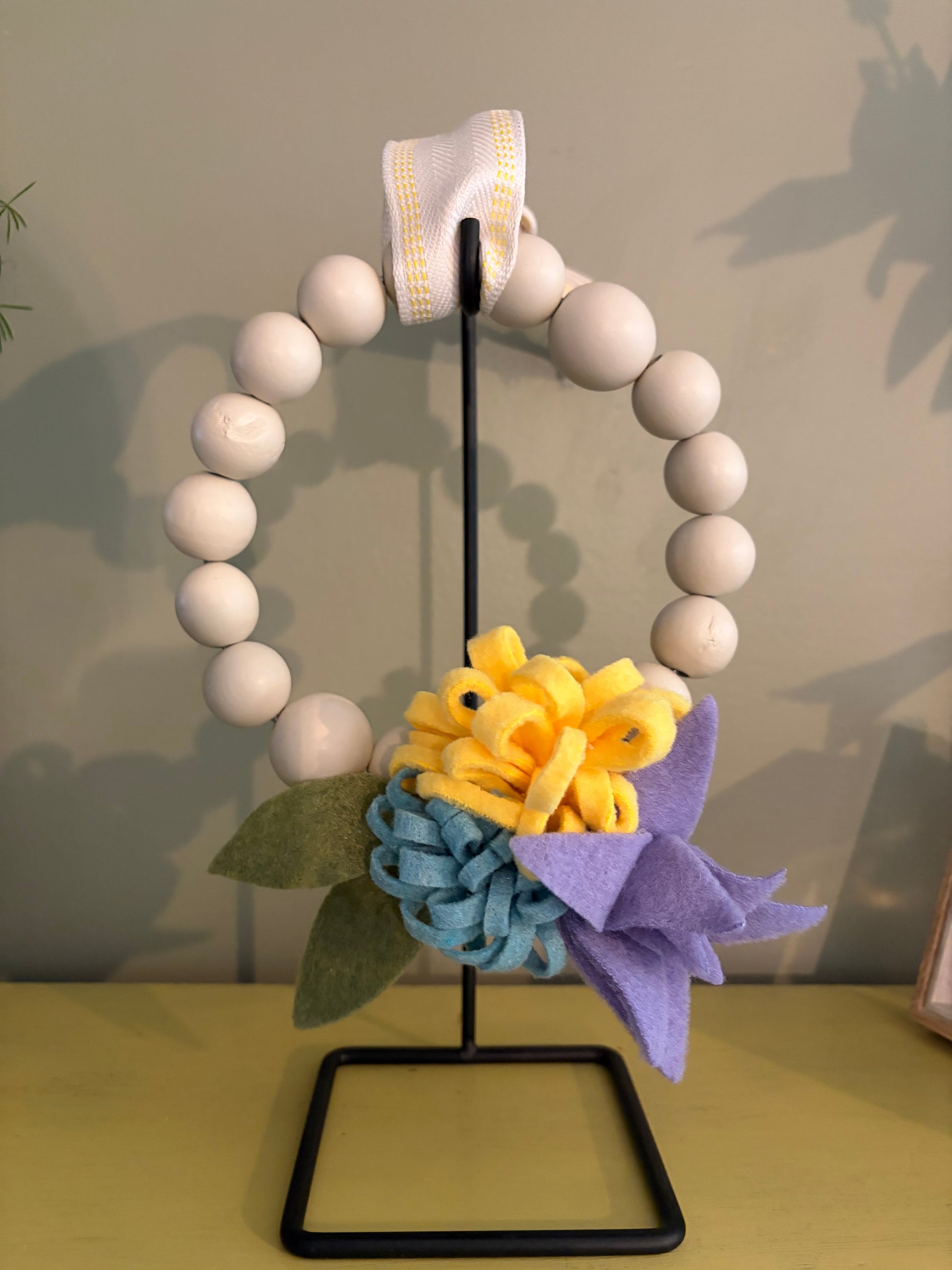 Beaded wreath with felt flowers or succulents.