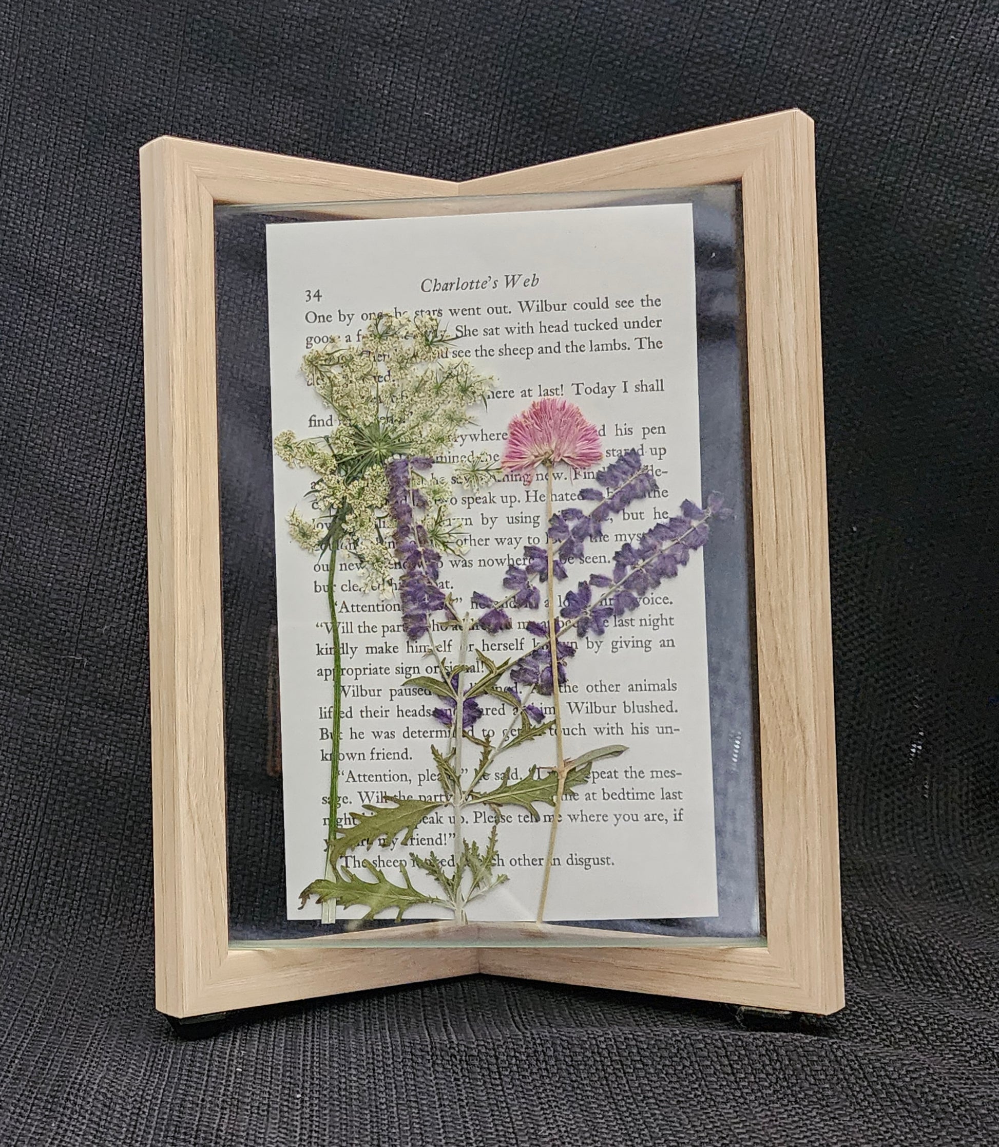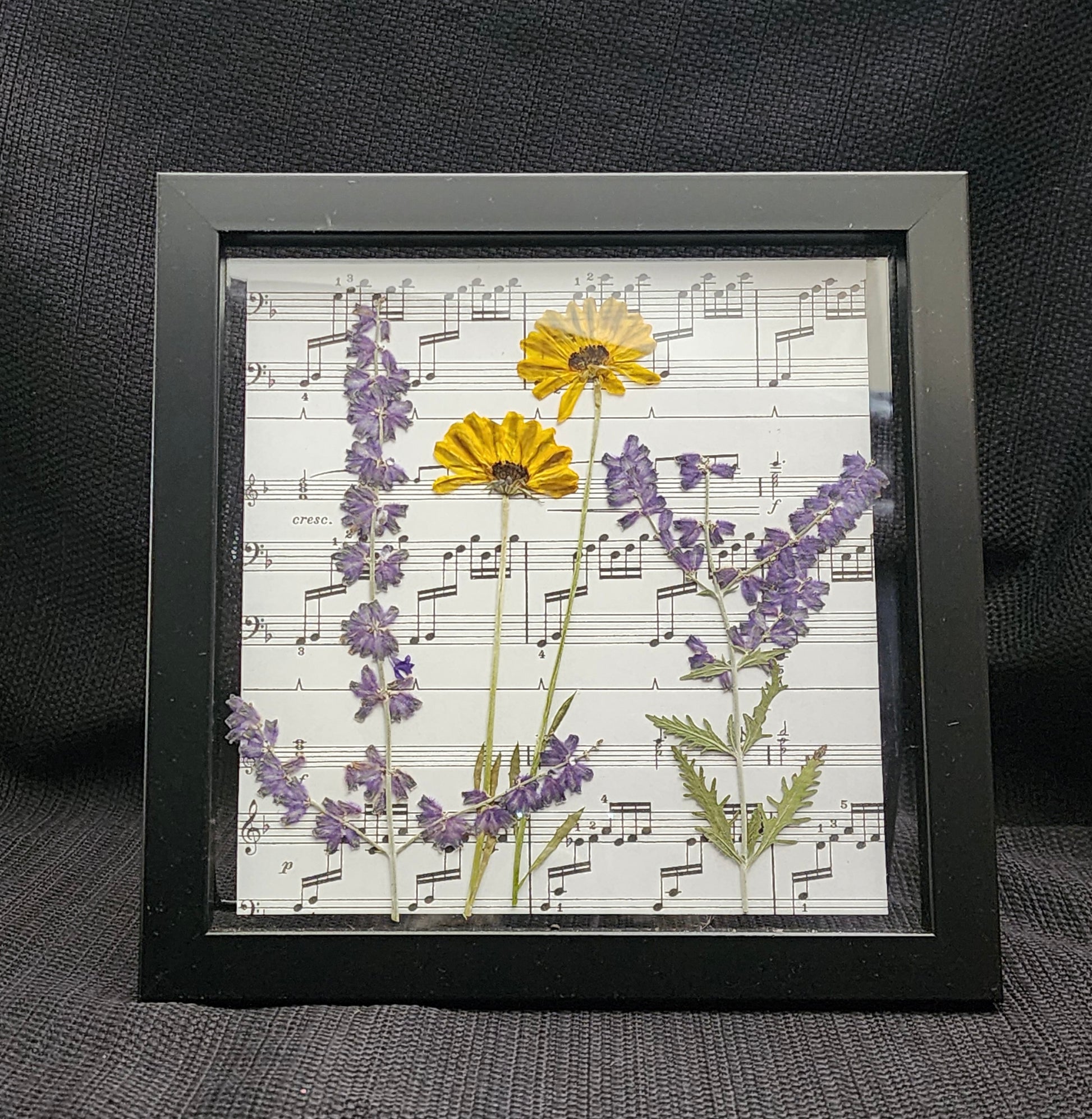 Framed pressed flowers on sheet music or a page from a story book.